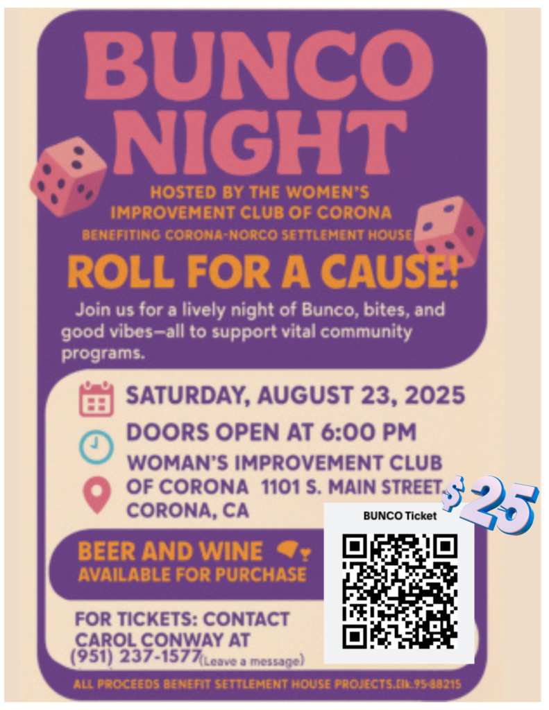 August 23, 2025 6PM – BUNCO Hosted by The Women’s Improvement Club